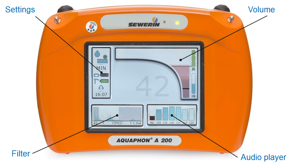 Combined with the advantages offered by the graphics of the integral LCD, the human ear remains an important tool for assessing incoming noises. Practice enables noises of different types and tones to be differentiated and actual leak noise to be distinguished from extraneous noise. To assist the operator the AQUAPHON® A 200 is supplied with headphones that provide outstanding sound reproduction.